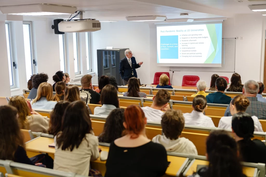 Am profitat de ocazie și i-am luat un scurt interviu cu privire la viitorul învățământului superior din perspectiva noilor provocări cu care se confruntă universitățile din SUA și din întreaga lume după pandemie, de la stagnarea și chiar scăderea bugetelor alocate învățământului superior și inflație până la problematici care țin de schimbările tehnologice și situația geopolitică complexă.