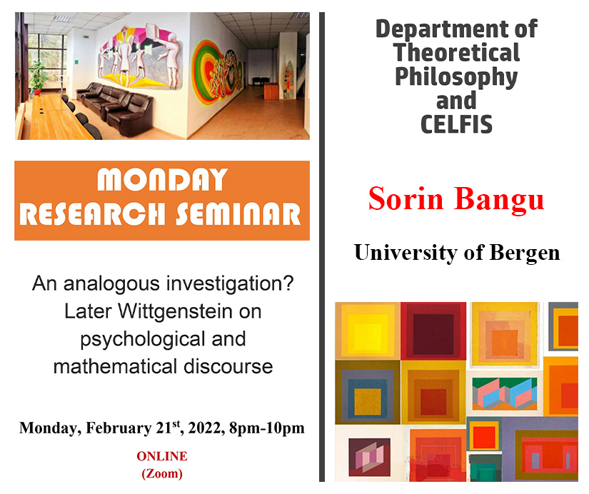 Luni, 21 februarie 2022, în cadrul seminarului de cercetare al Departamentului de Filosofie Teoretică, prof. univ. dr. Sorin Bangu de la Universitatea din Bergen (Norvegia), va susține conferința cu titlul “An analogous investigation? Later Wittgenstein on psychological and mathematical discourse”.