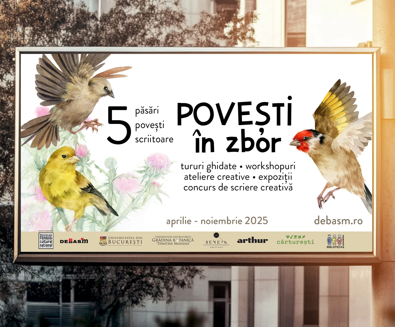Proiectul „Povești în zbor” este un proiect de intervenție culturală realizat de Asociația De Basm, co-finanțat de Administrația Fondului Cultural Național, în parteneriat cu Universitatea din București, Grădina Botanică „D. Brândză” București, Seneca Anticafe, Editura Arthur, Cărturești și Biblioteca Prichindeilor.