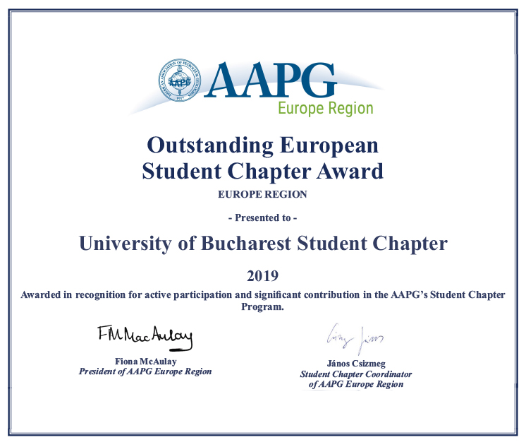 Bucharest Student Chapter din cadrul Facultății de Geologie și Geofizică a Universității din București, afiliat American Association of Petroleum Geologists (AAPG) a primit, în luna iunie 2019, titlul de Outstanding European Student Chapter Award pentru participarea activă și contribuția semnificativă în programul AAPG. Acest titlu se acordă o dată pe an unui singur chapter din Europa.
