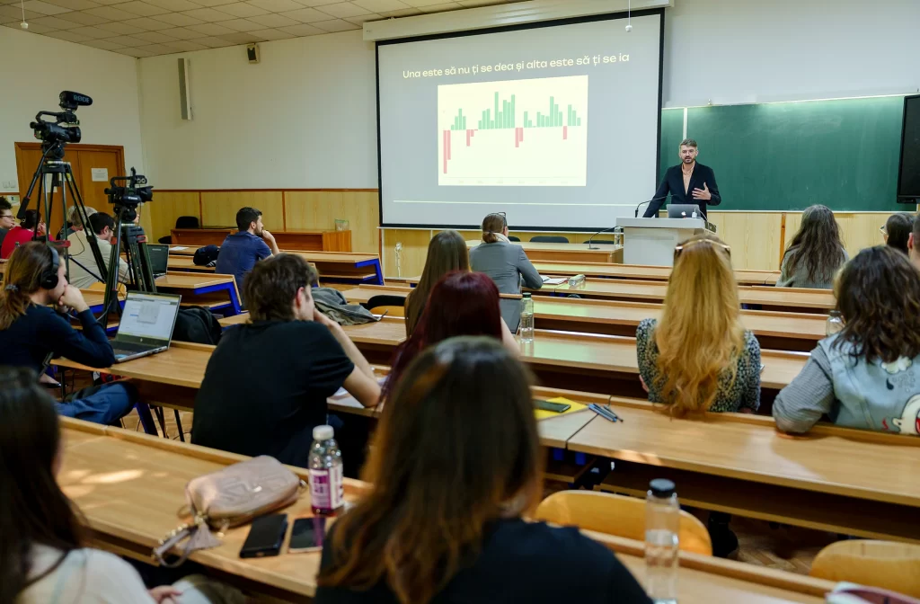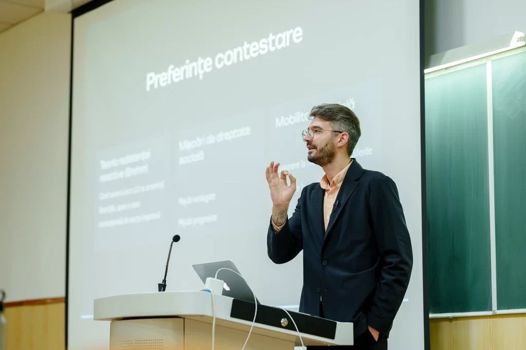 Prelegerea conf. univ. dr. Emilian Mihailov a analizat modul în care rețelele sociale modelează percepția publică asupra realității sociale, generând o imagine distorsionată, adesea dominată de pesimism și polarizare. Pornind de la narațiunile curente ale declinului – de la criza reprezentării politice la corupție și inegalitățile economice –, profesorul a arătat cum datele obiective nu susțin întotdeauna această viziune pesimistă, însă social media amplifică tendințele negative prin distribuirea disproporționată a conținutului extremist și conflictual.