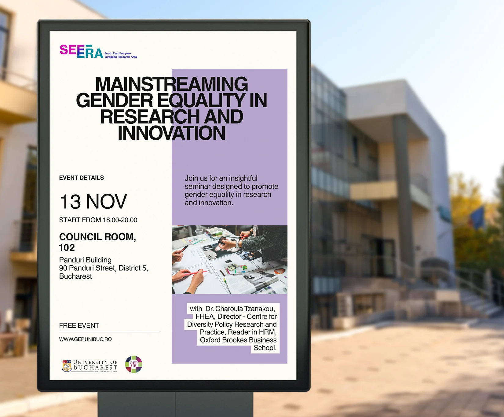 Evenimentul se înscrie în seria de activități de mentorat și formare doctorală derulate în cadrul proiectului SEE-ERA și oferă un spațiu de dialog interdisciplinar dedicat analizei modului în care perspectiva de gen poate fi integrată în cercetarea și inovarea științifică.