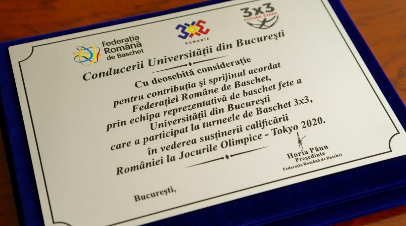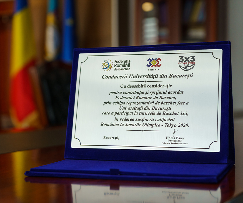 „Acordăm această distincție conducerii Universității din București, Cu deosebită considerație pentru contribuția și sprijinul acordat Federației Române de Baschet, prin echipa reprezentativă de baschet fete a Universității din București care a participat la turneele de Baschet 3X3, în vederea susținerii calificării României la Jocurile Olimpice – Tokyo 2020”, au subliniat semnatarii.