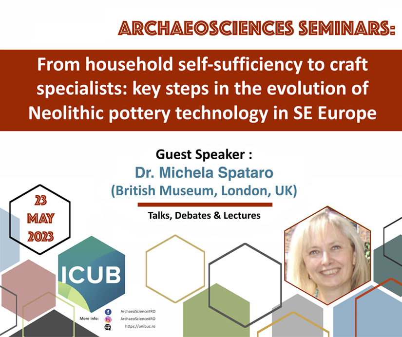 Marți, 23 mai 2023, Platforma ArchaeoSciences din cadrul Institutului de Cercetare al Universității din București (ICUB), a organizat conferința From household self-sufficiency to craft specialists: key steps in the evolution of Neolithic pottery technology in southeastern Europe, susținută de Dr. Michela Spataro de la British Museum (Marea Britanie).