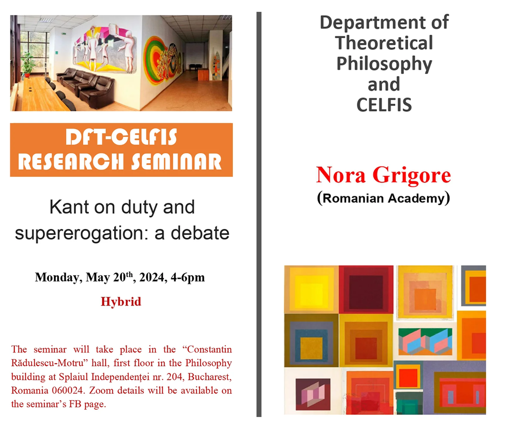 Conferința cu titlul „Kant on Duty and Supererogation: a Debate” va fi susținută de dr. Nora Grigore, cercetătoare în cadrul Institutului de Filosofie și Psihologie „Constantin Rădulescu-Motru” al Academiei Române. Mai multe detalii despre publicațiile sale recente sunt disponibile la acest link.