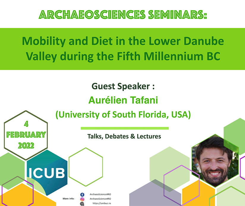 Vineri, 4 februarie 2022, Platforma ArchaeoSciences din cadrul Institutului de Cercetare al Universității din București organizează conferința Mobility and Diet in the Lower Danube Valley during the Fifth Millennium BC, susținută de drd. Aurélien Tafani de la University of South Florida (USF) din Statele Unite ale Americii.