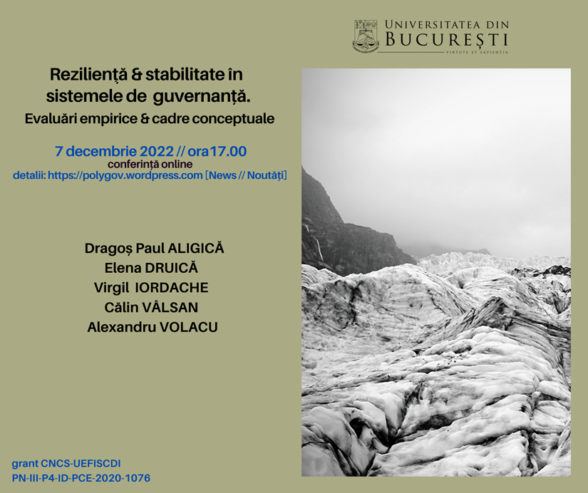 Miercuri, 7 decembrie 2022, începând cu ora 17:00, la Universitatea din București va avea loc conferința Reziliență și stabilitate în sistemele de guvernanță. Evaluări empirice și cadre conceptuale. Evenimentul, care se va desfășura exclusiv online (link acces), este organizat în cadrul proiectului Reziliență și stabilitate in sisteme de guvernanță policentrică. Abordare teoretică, empirică și aplicată, finanțat de CNCS-UEFISCDI (grant PN-III-P4-ID-PCE-2020-1076).