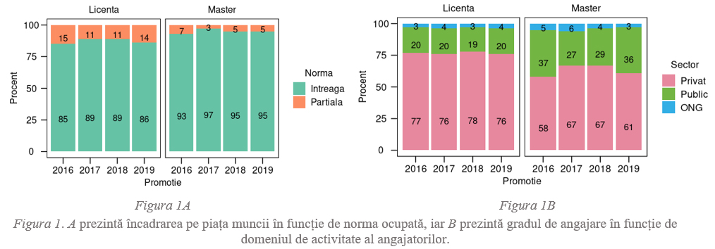 Referitor la tipul de normă cu care sunt angajați absolvenții UB cei mai mulți au declarat că sunt angajați cu normă întreagă, procentele fiind relativ stabile de-a lungul anilor pentru ambele cicluri de studiu. După cum era de așteptat, ponderea mai mare a celor ce lucrează cu jumătate de normă este reprezentată de absolvenții ciclului de licență, procentele scăzând la masterat – fapt asociat cu înaintarea în vârstă și experiență mai mare pe piața muncii. Sectorul în care activează absolvenții UB este un alt domeniu de interes. După finalizarea ciclului de licență, aproximativ trei din patru absolvenți s-au angajat în sectorul privat. La nivel de master, majoritatea respondenților au declarat, de asemenea, că activează în sectorul privat, însă observăm că procentele pentru sectorul public sunt mai ridicate (comparativ cu absolvenții unui ciclu de licență). Acest fapt poate indica două fenomene ce nu sunt mutual exclusive. Pe de o parte, putem vorbi despre nevoia de specializare suplimentară a unor persoane din zona bugetară, care aleg masterele UB pentru îndeplinirea acestei nevoi. Pe de altă parte, putem lansa și ipotezele că finalizarea unui program de master facilitează angajarea în sectorul public sau că îi determină pe unii absolvenți să își schimbe locul de muncă, dinspre sectorul privat către cel public.