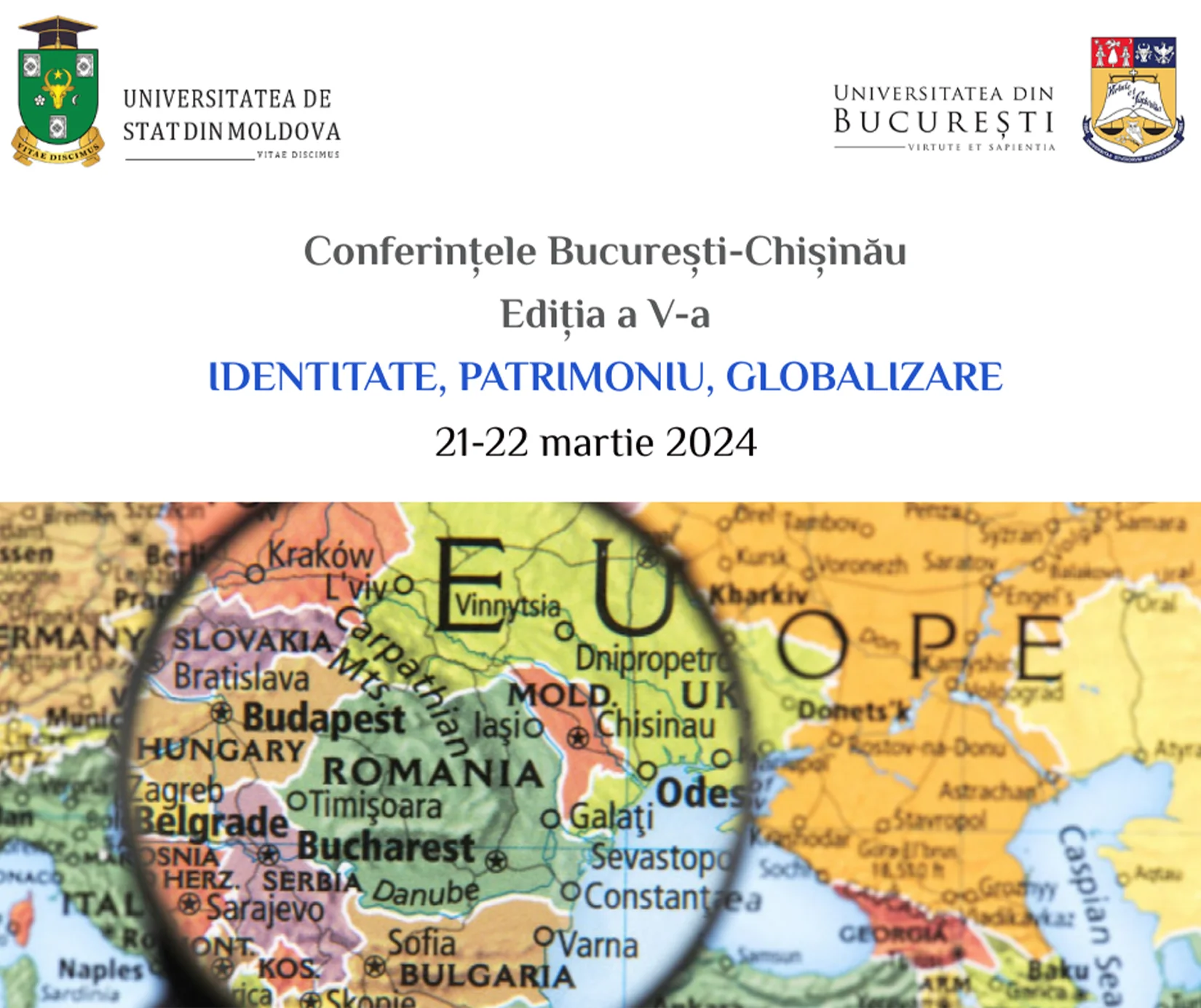 În perioada 21-22 martie 2024, Facultatea de Filosofie și Facultatea de Istorie ale Universității din București și Facultatea de Istorie și Filosofie a Universității de Stat din Moldova organizează cea de-a cincea ediție a seriei de Conferințe București-Chișinău, cu tematica „Identitate, patrimoniu, globalizare”.