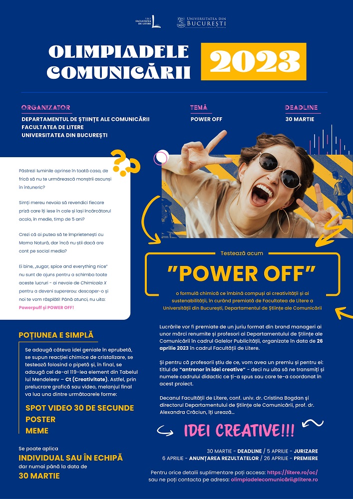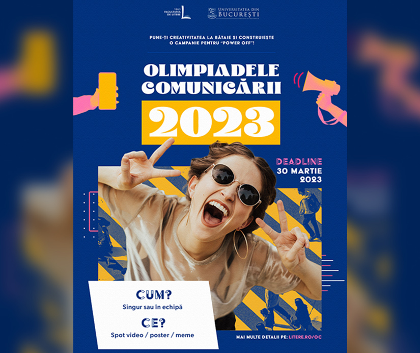 Până joi, 30 martie, Departamentul de Științe ale Comunicării din cadrul Facultății de Litere a Universității din București așteaptă liceenii să se înscrie la ediția din anul 2023 a „Olimpiadelor Comunicării”. Tema din acest an a competiției este “Power Off”.