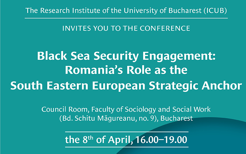 Luni, 8 aprilie 2019, Secțiunea de Științe Sociale din cadrul Institutului de Cercetare al Universității din București organizează evenimentul „Black Sea Security Engagement: Romania’s Role as the South Eastern European Strategic Anchor”. Conferința va avea loc începând cu ora 16:00 în Sala de Consiliu a Facultății de Sociologie și Asistență Socială, Universitatea din București (Str. Schitu Măgureanu. nr. 9).