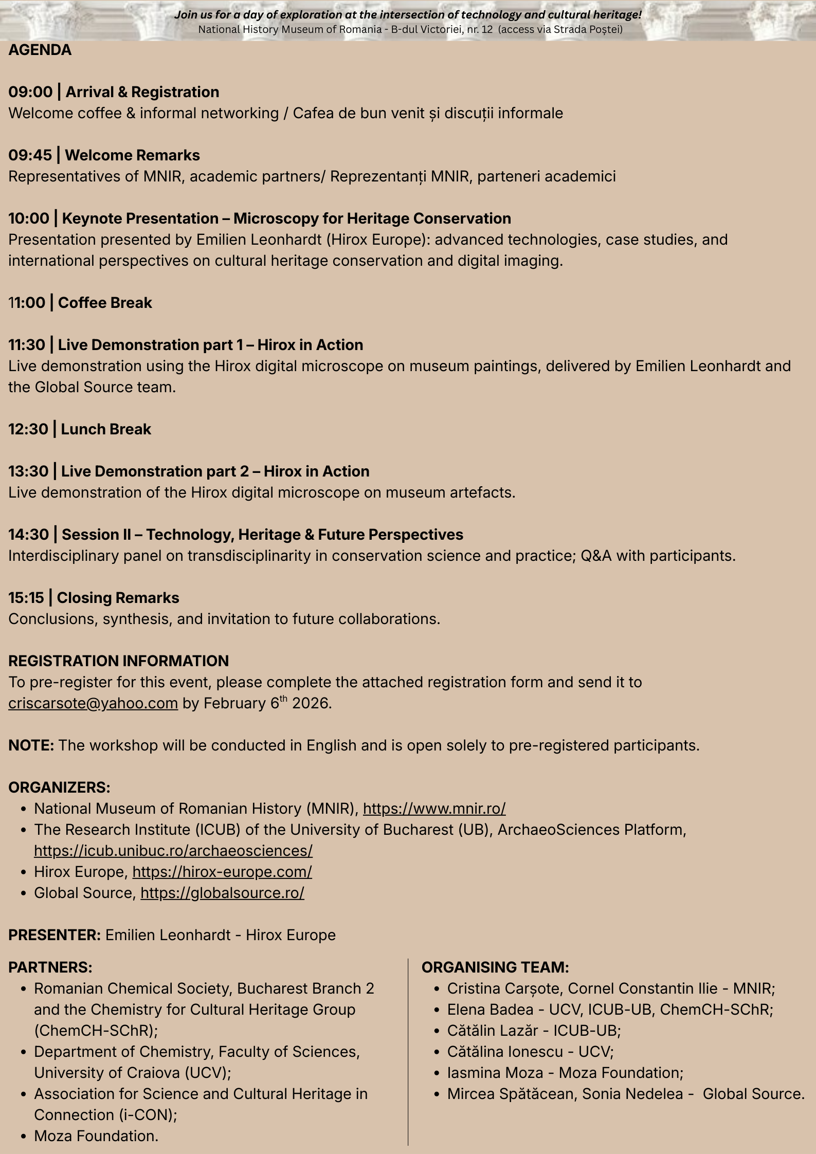 - Sesiunea de patrimoniu cultural și conservare Microscopic Insights into Cultural Heritage – Joi, 12 februarie 2026, Muzeul Național de Istorie a României – Sala Mihai Viteazul.