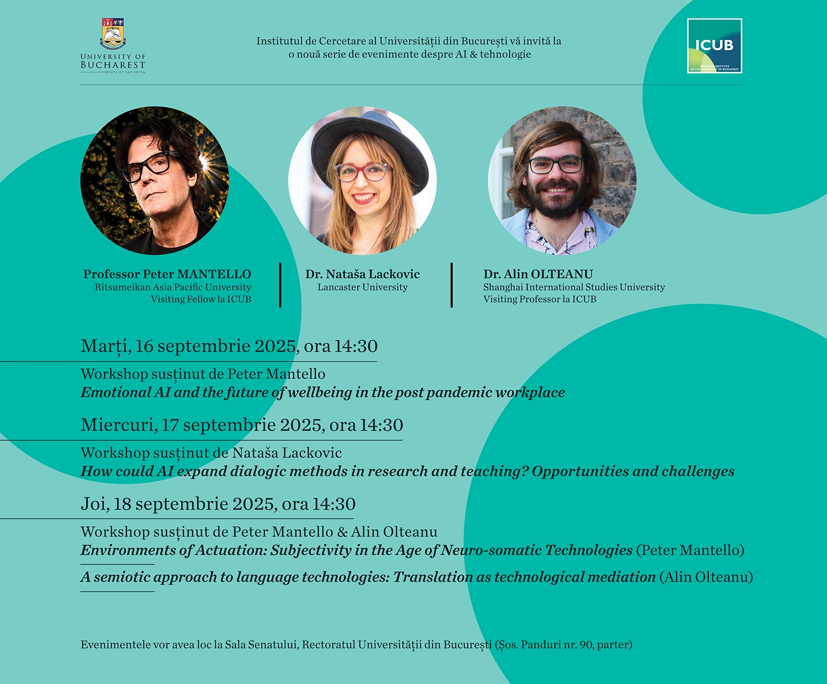 Institutul de Cercetare al Universității din București (ICUB) vă invită la o nouă serie de evenimente despre AI & tehnologie: 16, 17 și 18 septembrie 2025, ora 14:30, la Rectorat