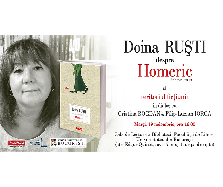 Marți, 19 noiembrie 2019, Facultatea de Litere organizează o întâlnire cu scriitoarea Doina Ruști, care își va prezenta cel mai recent roman, „Homeric”, apărut la editura Polirom anul acesta. Evenimentul va avea loc începând cu ora 16:00, în Sala de Lectură a Bibliotecii Facultății de Litere (str. Edgar Quinet, nr. 5-7).