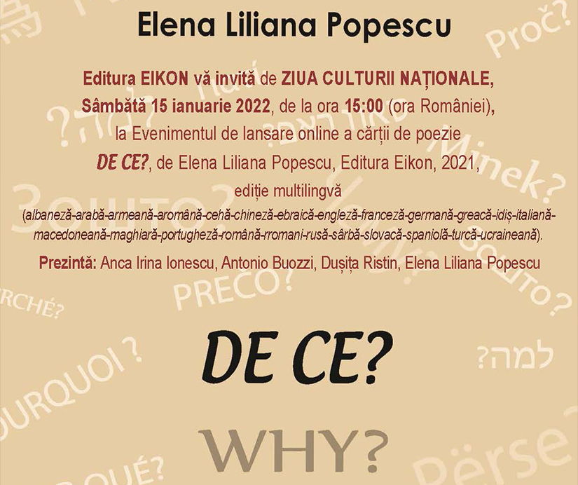 Sâmbătă, 15 ianuarie 2022, prof. univ. dr. Elena Liliana Popescu, cadru didactic la Facultatea de Matematică și Informatică a Universității din București, lansează, la editura Eikon, volumul multilingv de poezie „De ce?”. Evenimentul va avea loc online, începând cu ora 15:00.