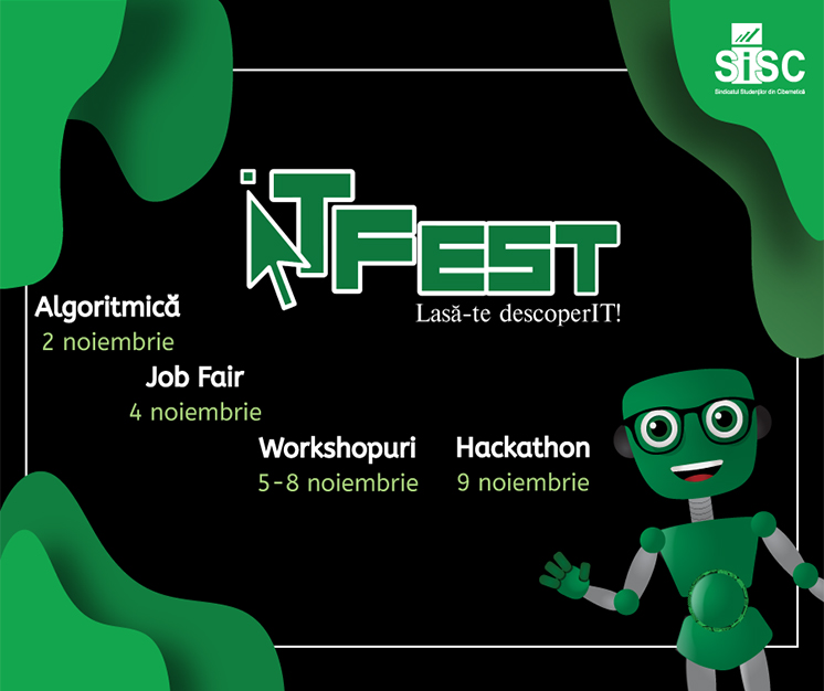 Universitatea din București împreună cu Sindicatul Studenților din Facultatea de Cibernetică, Statistică și Informatică Economică invită pasionații de IT la ce-a de a XII-a ediție a proiectului ITFest. Ediția de anul acesta a debutat pe 30 septembrie cu Open Day și continuă în lunile octombrie și noiembrie cu mai multe evenimente dedicate pasionaților de IT.