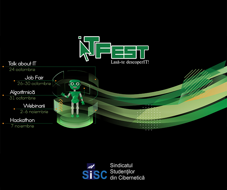Universitatea din București, împreună cu Sindicatul Studenților din Facultatea de Cibernetică, Statistică și Informatică Economică, invită pasionații de IT la cea de-a XIII-a ediție a proiectului ITFest. Ediția de anul acesta, care se va desfășura exclusiv online, va avea loc în perioada 24 octombrie-7 noiembrie 2020.