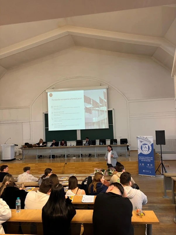 Miercuri, 22 aprilie 2026, Facultatea de Administrație și Afaceri a găzduit evenimentul „Educație financiară pentru studenți – Cum gestionăm banii și ne construim viitorul”, organizat de Asociația Alumni FAA cu sprijinul CEC Bank. Amfiteatrul R3 a reunit studenți și specialiști într-o discuție practică și directă despre bani, carieră și antreprenoriat.