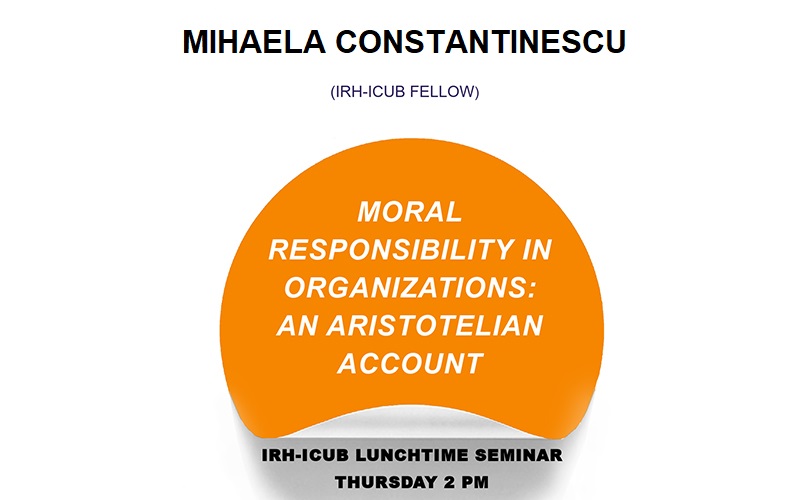 Joi, 11 aprilie 2019, Secțiunea de Științe Umaniste a Institutului de Cercetare al Universității din București organizează, în cadrul seriei Lunchtime Seminar, prelegerea Moral Responsibility in Organizations: An Aristotelian Account susținută de Mihaela Șimon. Evenimentul va avea loc începând cu ora 14:00, în Sala de Seminare a SSU–ICUB (str. Dimitrie Brândză, nr. 1).