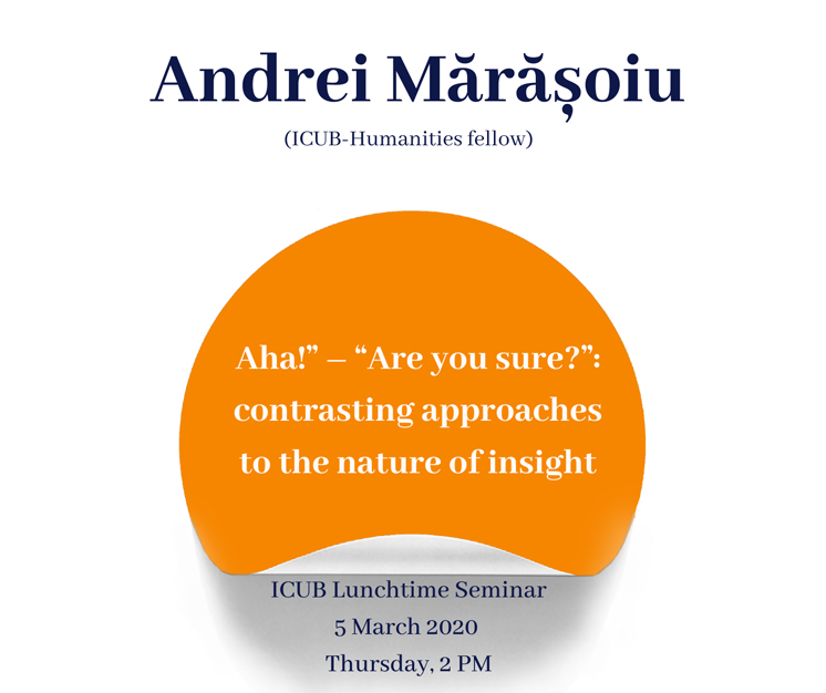 Joi, 5 martie 2020, Secțiunea de Științe Umaniste a Institutului de Cercetare al Universității din București organizează, în cadrul seriei Lunchtime Seminar, prelegerea “Aha!” – “Are you sure?”: contrasting approaches to the nature of insight, susținută de dr. Andrei Mărășoiu, bursier ICUB. Evenimentul vor avea loc începând cu ora 14.00, în sala de seminare a SSU–ICUB (str. Dimitrie Brândză, nr. 1).