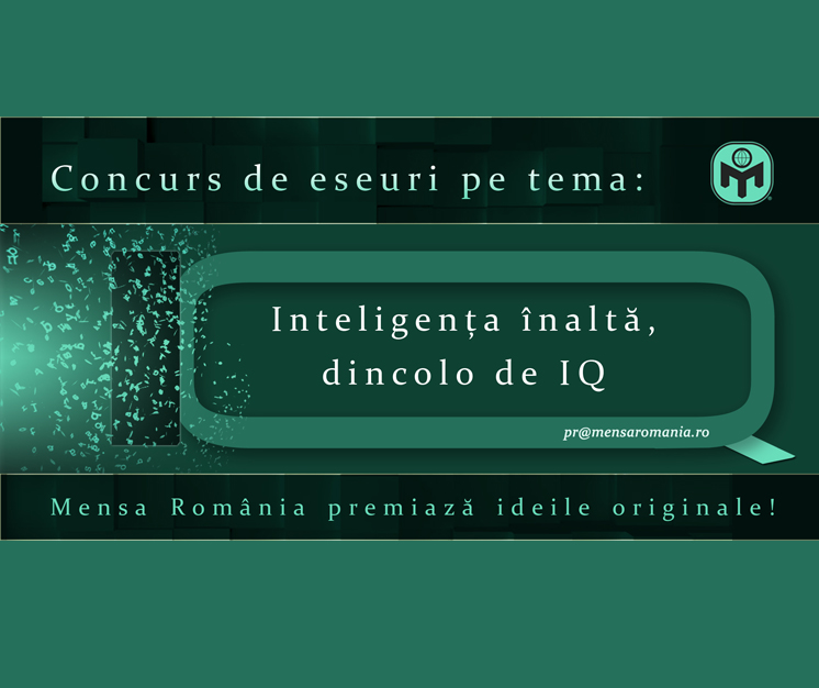 În luna februarie, Mensa România organizează un concurs de eseuri pe tema „Inteligența înaltă, dincolo de IQ”. Competiția este adresată în exclusivitate persoanelor care nu dețin calitatea de membru Mensa și cuprinde două secțiuni, în funcție de vârsta împlinită la data trimiterii textului: sub 16 ani și minim 16 ani. Juriul va aprecia originalitatea ideilor, structura, claritatea și estetica eseului, calitatea argumentării, dar și deschiderea de noi planuri de reflecție. Eseurile trebuie trimise în perioada 1–21 februarie (ora 23:59), la adresa pr@mensaromania.ro. Mai multe informații sunt disponibile aici. Rezultatele concursului vor fi publicate pe pagina oficială a organizației Mensa România, la data de 29.02.2020.