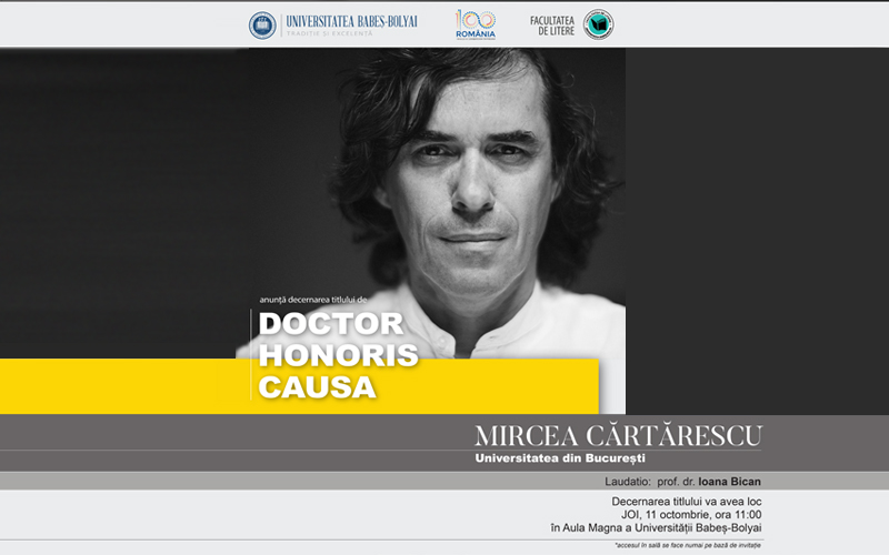 On Thursday, the 11th of October 2018, the writer Mircea Cărtărescu, Professor at the Faculty of Letters of the University of Bucharest, was awarded the title of Doctor Honoris Causa of the University “Babeș-Bolyai” from Cluj-Napoca. The ceremony took place at 11,00, in Aula Magna of the “Babeș-Bolyai” University, and laudatio was delivered by PhD., Prof. Ioana Bican.
