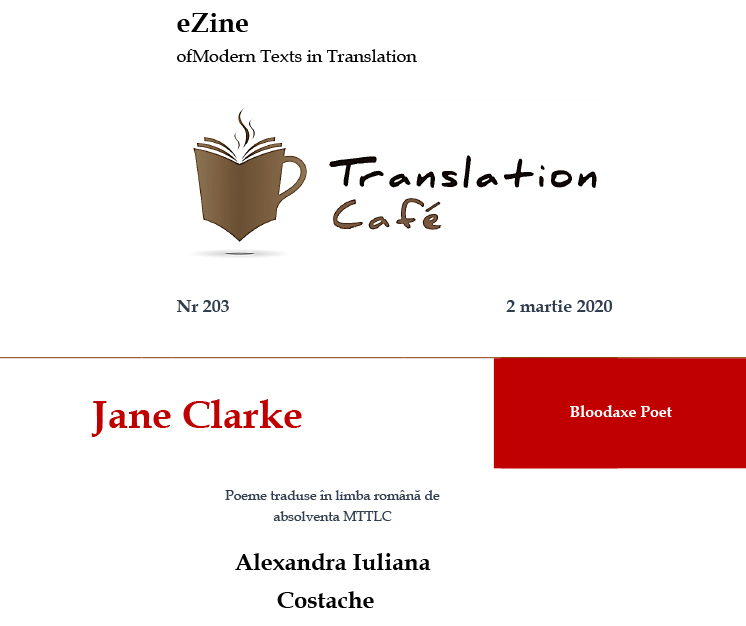 eZine of Modern Texts in Translation – Translation Café No 203, sub auspiciile Universității din Bucureşti, The British Council, Institutului Cultural Român și Uniunii Scriitorilor din România, anunță publicarea volumului „Poeme de şi interviu cu Jane Clarke”, tradus în limba română de absolventa MTTLC Alexandra Iuliana Costache în cadrul disertaţiei masterale.