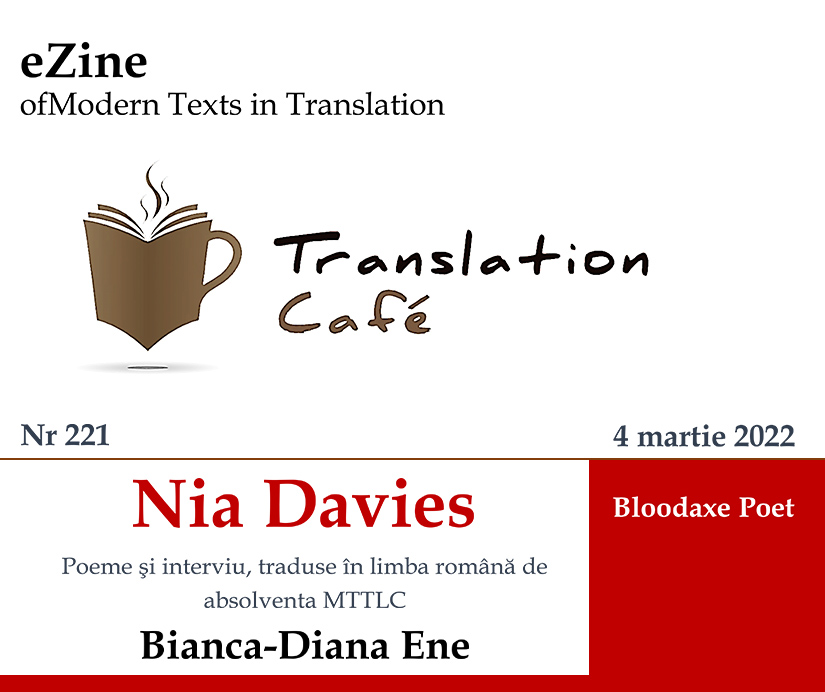 eZine of Modern Texts in Translation – Translation Café No 221, sub auspiciile Universității din Bucureşti, The British Council, Institutului Cultural Român și Uniunii Scriitorilor din România, anunță publicarea volumului „Poeme de, și interviu cu Nia Davis”, tradus în limba română de absolventa MTTLC Bianca-Diana Ene, în cadrul disertației masterale.