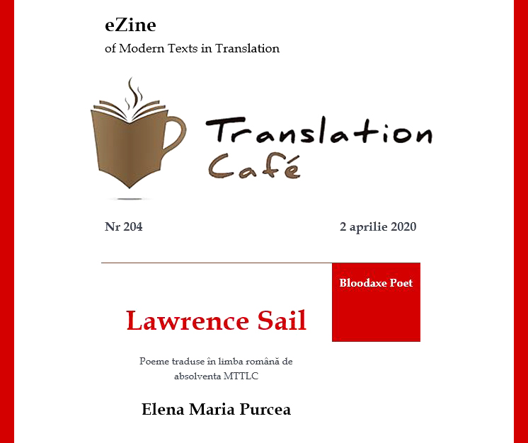 eZine of Modern Texts in Translation – Translation Café No 204, sub auspiciile Universității din Bucureşti, The British Council, Institutului Cultural Român și Uniunii Scriitorilor din România, anunță publicarea volumului „Poeme și interviu cu Lawrence Sail”, tradus în limba română de absolventa MTTLC Elena Maria Purcea, în urma Masterclass-ului la care a fost invitată editura de poezie Bloodaxe Books din Marea Britanie.