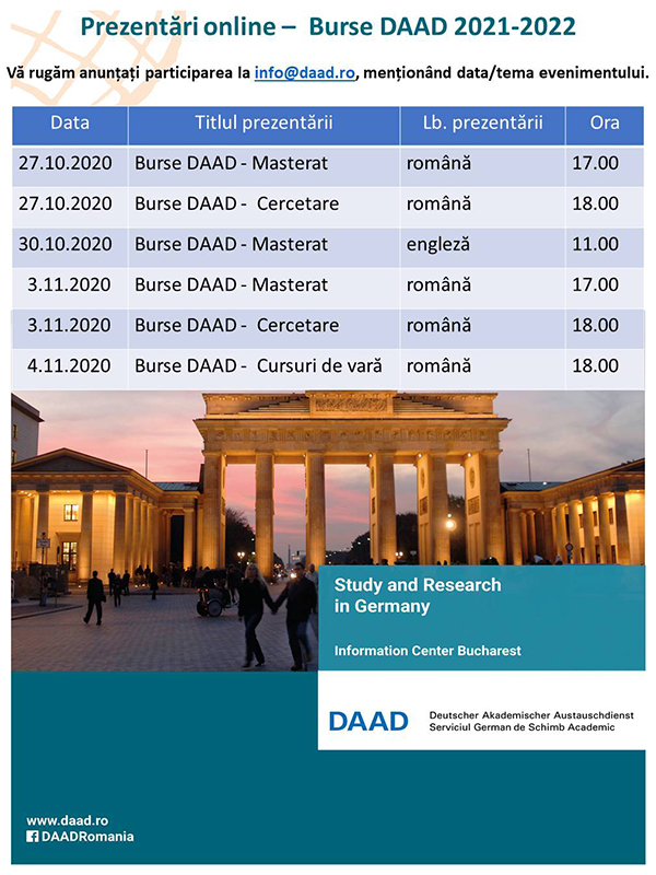 Persoanele interesate de participarea la webinarele de prezentare a burselor DAAD pentru anul universitar 2021-2022 sunt rugate să-și anunțe intenția la adresa de mail info@daad.ro, menționând data/ tema evenimentului. Programul complet al prezentărilor poate fi accesat aici.