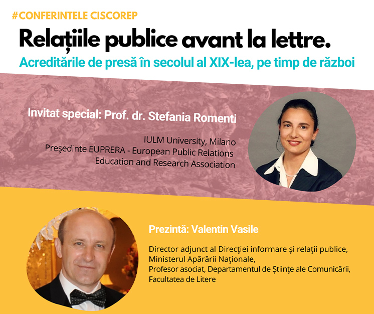 Miercuri, 3 martie 2021, Centrul de Cercetări Interdisciplinare în Științele Comunicării și Relații Publice și Facultatea de Litere a UB, în colaborare cu EUPRERA, organizează online, începând cu ora 17:00, conferința Relațiile publice avant la lettre. Acreditările de presă în secolul al XIX-lea, în timp de război.
