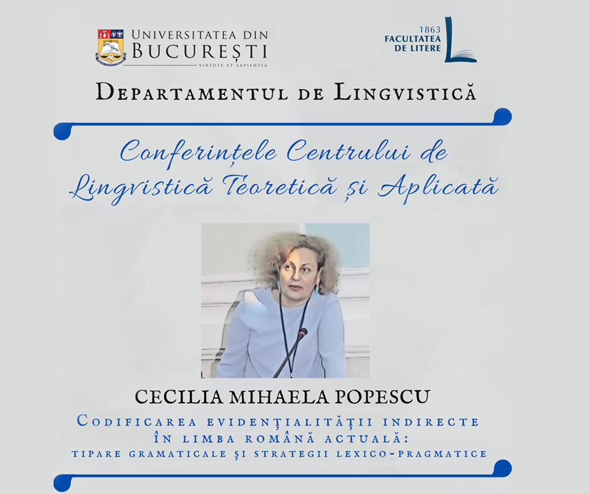 Joi, 31 martie 2022, Departamentul de Lingvistică al Facultății de Litere continuă ciclul Conferințelor Centrului de Lingvistică Teoretică și Aplicată cu o evenimentul „Codificarea evidențialității indirecte în limba română actuală: tipare gramaticale și strategii lexico-pragmatice”. Întâlnirea, care o are ca invitată pe prof. univ. dr. habil. Cecilia Mihaela Popescu, va avea loc online începând cu ora 18:00.