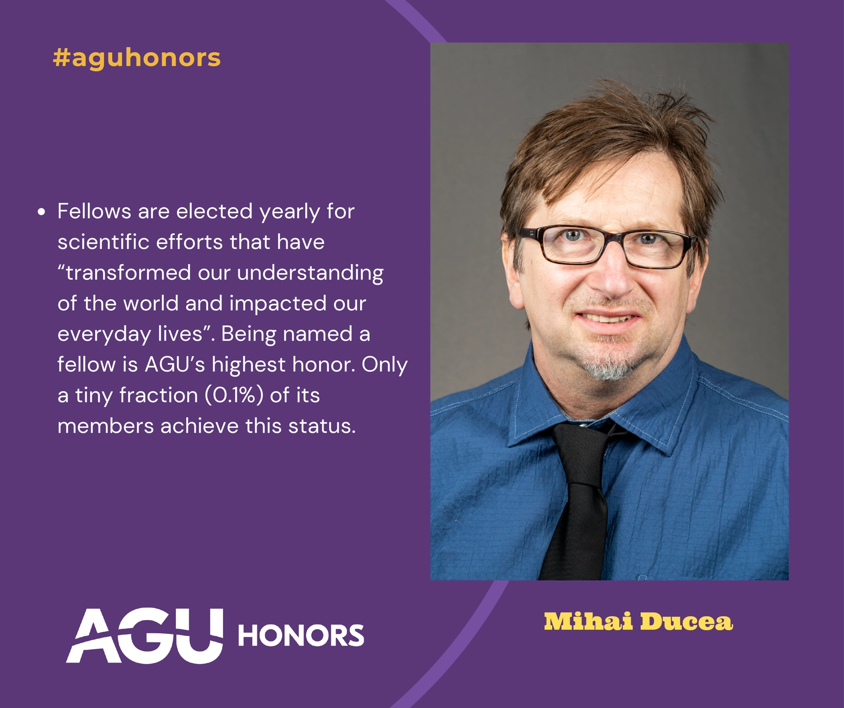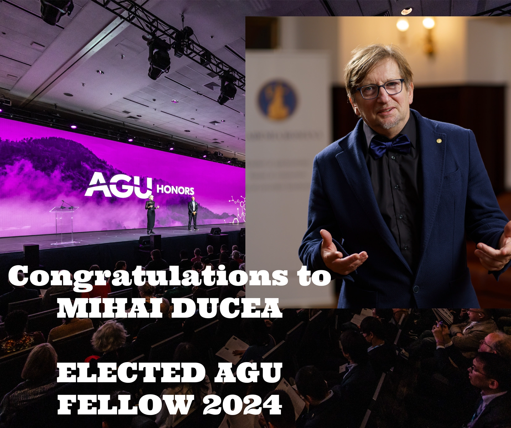 Miercuri, 18 septembrie 2024, profesorul Mihai Ducea, cadru didactic la Facultatea de Geologie și Geofizică a UB și coordonator al Secțiunii de Științele Vieții, Mediului și ale Pământului a ICUB, a fost ales Fellow al renumitei Uniuni Americane de Geofizică (American Geophysical Union – AGU).