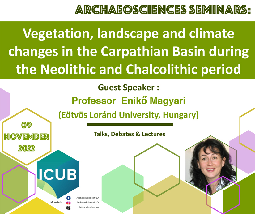 Miercuri, 9 noiembrie 2022, Divizia ArchaeoSciences din cadrul Institutului de Cercetare al Universității din București organizează conferința Vegetation, landscape and climate changes in the Carpathian Basin during the Neolithic and Chalcolithic period, susținută de prof. univ. dr. Enikő Magyari, cadru didactic la Eötvös Loránd University din Ungaria.