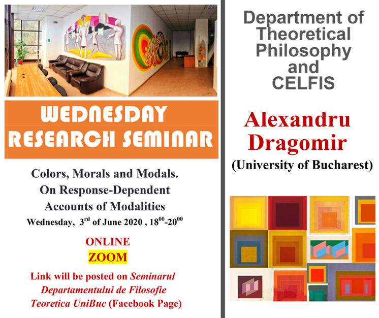 Miercuri, 3 iunie 2020, în cadrul Seminarului de Cercetare al Departamentului de Filosofie Teoretică, drd. Alexandru Dragomir de la Universitatea din București a susținut online prelegerea “Colors, Morals and Modals. On Response-Dependent Accounts of Modalities”.