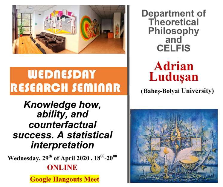 Miercuri, 29 aprilie 2020, în cadrul Seminarului de Cercetare al Departamentului de Filosofie Teoretică, cercetător dr. Adrian Ludușan va susține online prelegerea „Knowledge how, ability, and counterfactual success. A statistical interpretation”. Invitatul este cercetător în cadrul Departamentului de Studii Europene al Universității Babeș-Bolyai, iar domeniul său predilect de expertiză este logica. Este autorul mai multor articole de referință, între care amintim „Determinacy of reference, schematic theories, and internal categoricity” și „Categoricity, Open-Ended Schemas and Peano Arithmetic”.