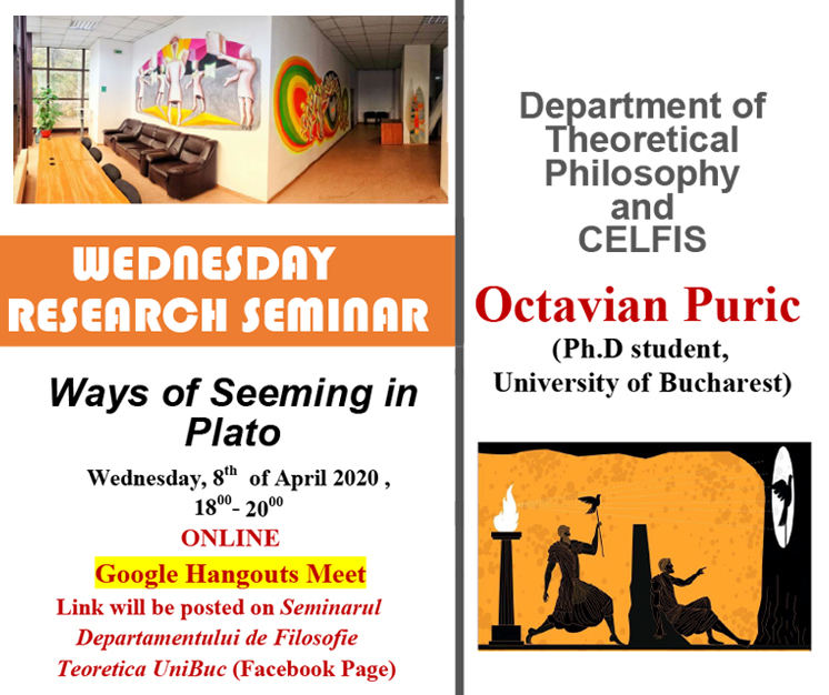 Miercuri, 8 aprilie 2020, în cadrul Seminarului de Cercetare al Departamentului de Filosofie Teoretică, Octavian Puric, doctorand al Universității din București, va susține online prelegerea Ways of Seeming in Plato. Evenimentul va avea loc începând cu ora 18:00 și se va desfășura prin intermediul aplicației Google Hangouts Meet. Link-ul disponibil pentru accesarea seminarului va fi disponibil pe pagina de Facebook a Seminarului Departamentului de Filosofie Teoretica UniBuc, aici.