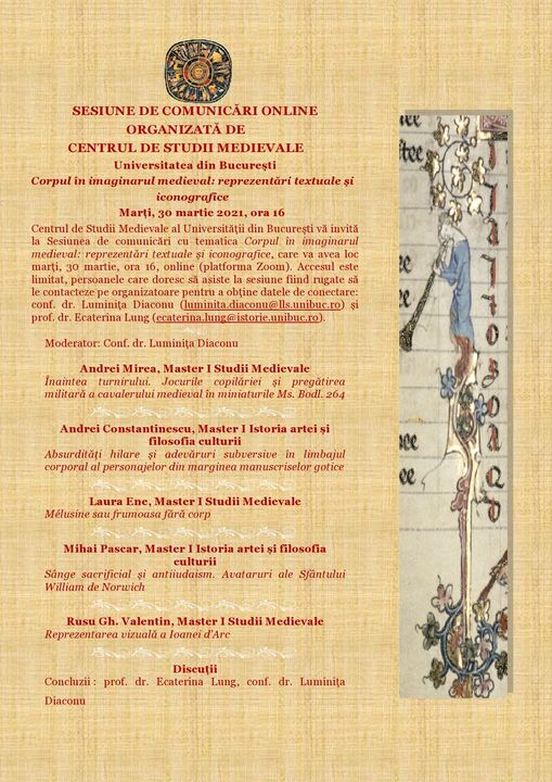Marți, 30 martie 2021, Centrul de Studii Medievale din cadrul Facultății de Istorie a Universității din București organizează online sesiunea de comunicări cu tematica Corpul în imaginarul medieval: reprezentări textuale și iconografice. Evenimentul va avea loc începând cu ora 16:00.