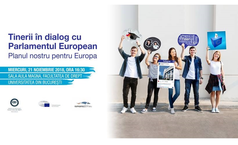 Universitatea din Bucureşti, în parteneriat cu Parlamentul European, organizează miercuri, 21 noiembrie 2018, evenimentul Tinerii în dialog cu Parlamentul European. Planul nostru pentru Europa. Dialogul va avea loc în Aula Magna a Facultăţii de Drept, în intervalul orar 16:30-18:30.