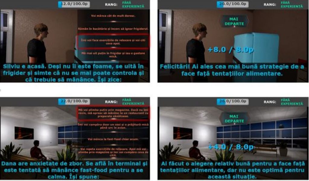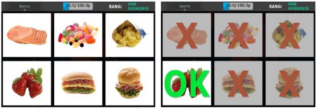 Intervențiile implicite sunt construite, de asemenea, sub forma de joc și constau în reantrenarea atenției dinspre imaginile cu alimente nesănătoase înspre cele cu alimente sănătoase. Mai exact, pe ecran vor apărea imagini cu mai multe alimente, iar utilizatorul va trebui să aleagă cât mai repede alimentul sănătos. El va primi puncte în plus pentru viteza și corectitudinea alegerilor lui (Figura 2).
