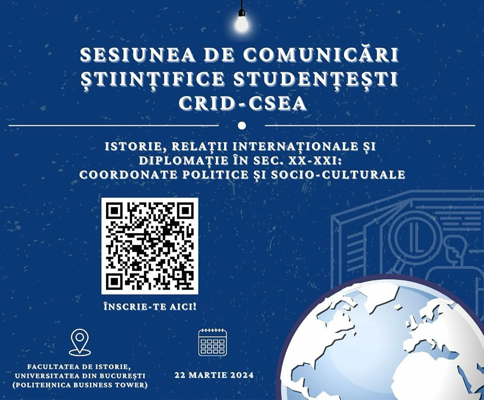 Cercul de Relații Internaționale și Diplomație, în colaborare cu Centrul de Studii Euro-Atlantice „Prof. Univ. Dr. Constantin Bușe” și Comunitatea Masterelor de Istorie Globală, Relații Internaționale și Diplomație din cadrul Facultății de Istorie a Universității din București, vă invită să participați la prima ediție a Sesiunii de Comunicări Științifice Studențești.