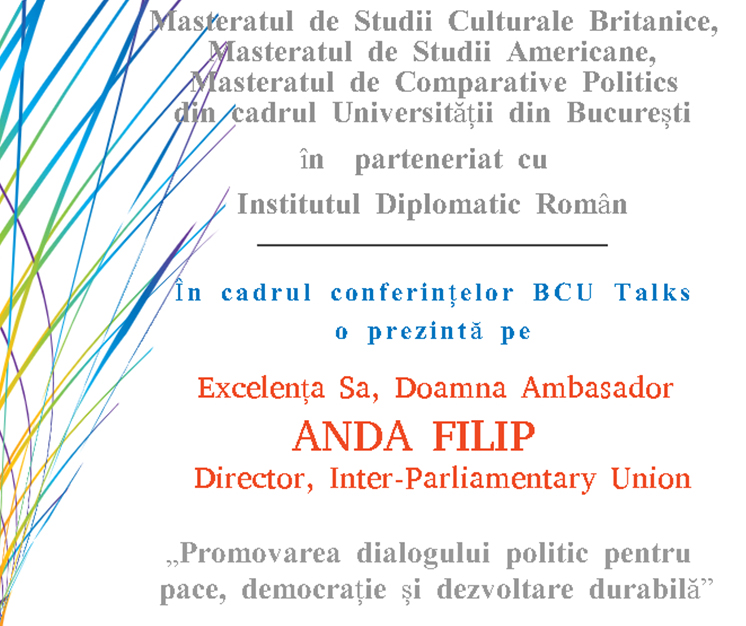 Conferința intitulată „Promovarea dialogului politic pentru pace, democrație și dezvoltare durabilă” și moderată de prof. univ. dr. Bogdan Ștefănescu este organizată în colaborare cu programele masterale de Studii Americane din cadrul Facultății de Limbi și Literaturi Străine a UB și Comparative Politics a Facultății de Științe Politice a UB.