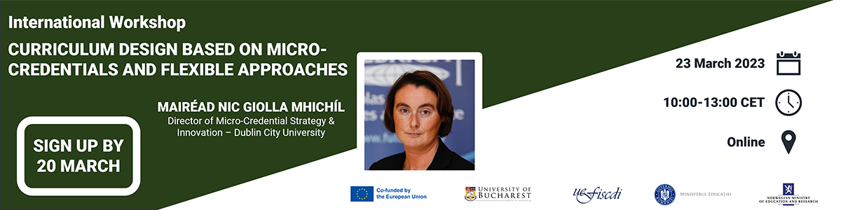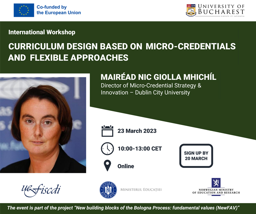 Joi, 23 martie 2023, Universitatea din București și Unitatea Executivă pentru Finanțarea Învățământului Superior, a Cercetării, Dezvoltării și Inovării (UEFISCDI) organizează workshop-ul internațional “Curriculum design based on micro-credentials and flexible approaches”. Evenimentul va avea loc în format online, în intervalul orar 10:00-13:00 CET (11:00-14:00 EET).