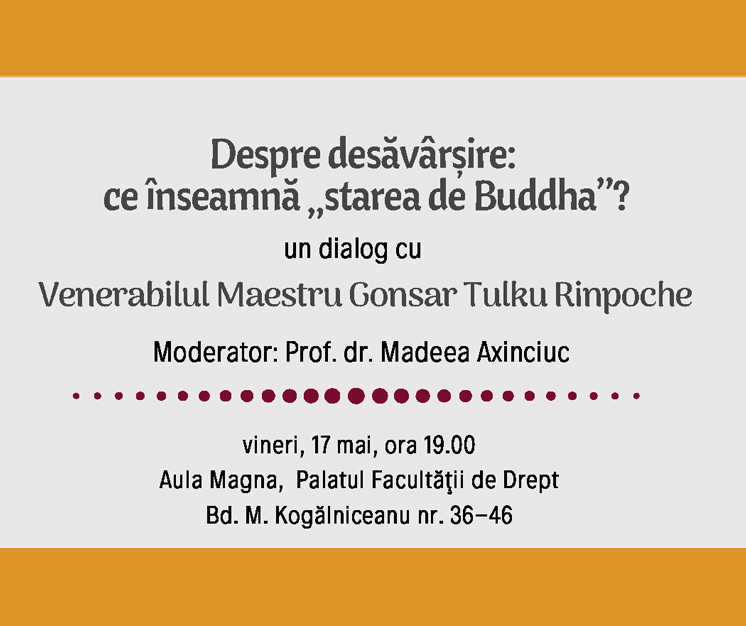Vineri, 17 mai 2019, programul de Studii Religioase – Texte și Tradiții din cadrul Facultății de Limbi și Literaturi Străine, în parteneriat cu Centrul de Înalte Studii Tibetane Rabten Choeling din Elveția și Asociația Prietenii Editurii Rabten, organizează dialogul intitulat „Despre desăvârșire: ce înseamnă starea de Buddha?”. Evenimentul va avea loc începând cu ora 19:00, în Aula Magna a Facultății de Drept (Bd. Mihail Kogălniceanu, nr. 36-46).