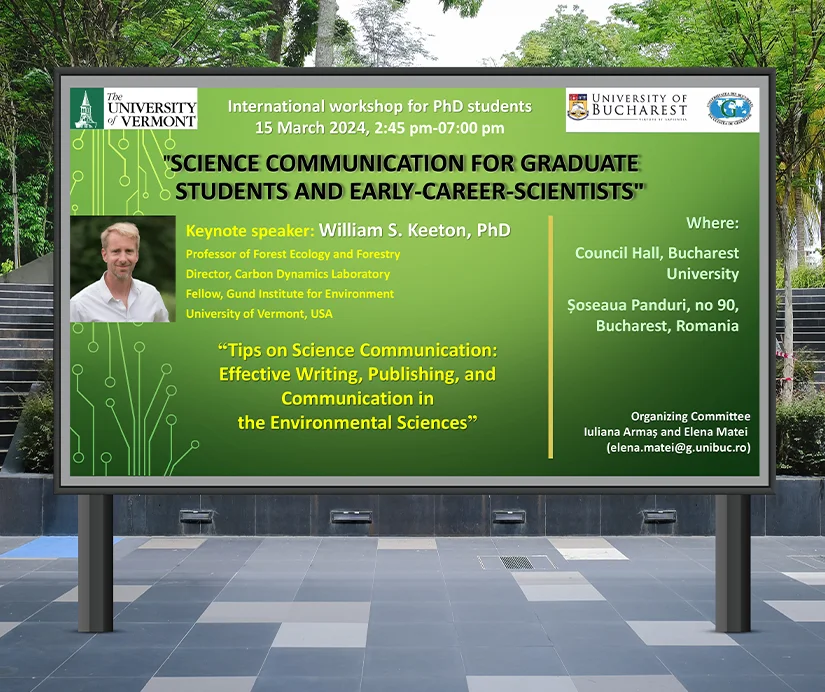Workshopul se va desfășura între orele 14:00-19:00, în sala Consiliului de la Rectoratul Universității din București, (Șoseaua Panduri, nr. 90, București) și îl propune ca invitat de onoare pe profesorul William S. Keeton, director al Laboratorului de dinamică a carbonului la Universitatea Vermont, căruia Universitatea din București i-a decernat titlul de Profesor Honoris Causa în 2022. Invitatul va susține și dezbate tema „Tips on Science Communication: Effective Writing, Publishing, and Communication in the Environmental Sciences”.