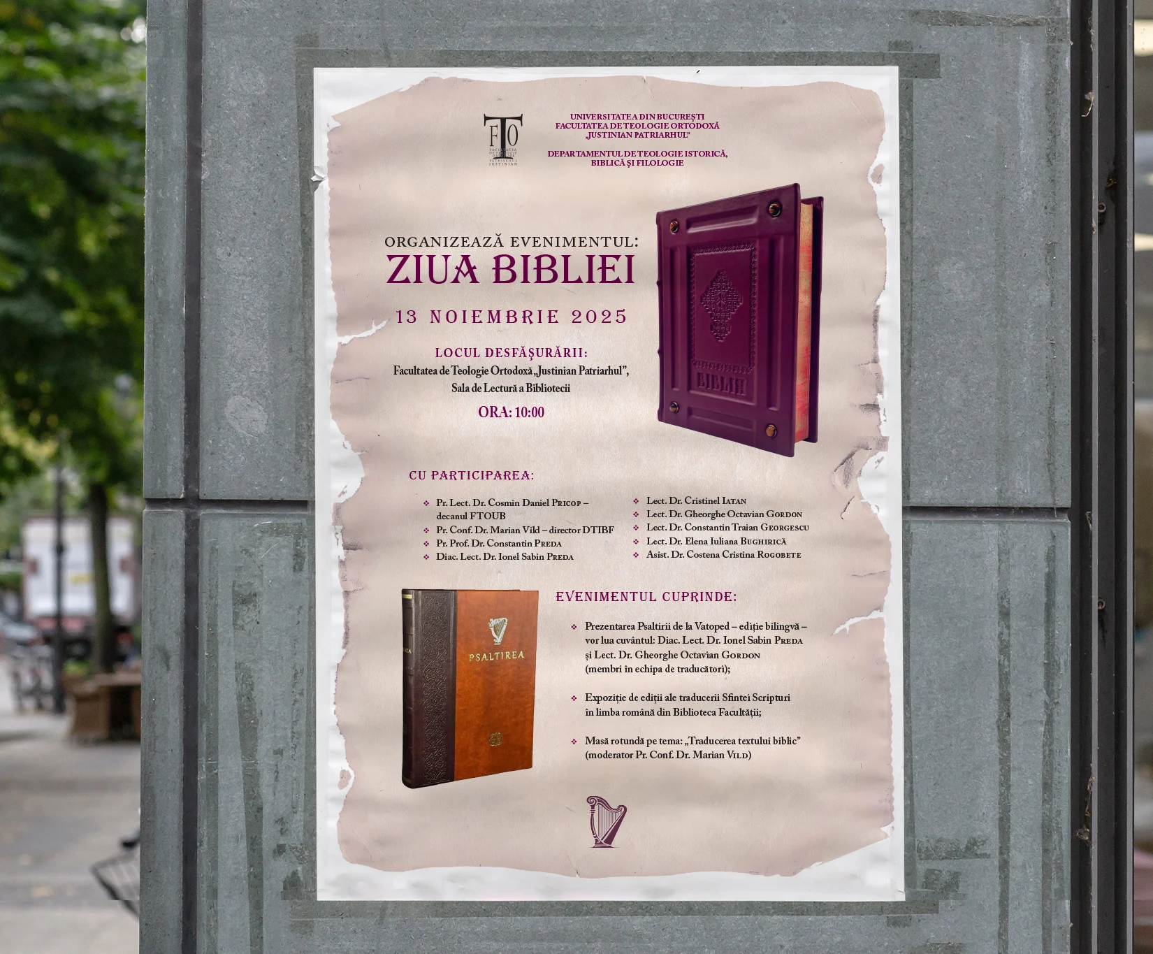 Joi, 13 noiembrie 2025, Departamentul de Teologie Istorică, Biblică și Filologie din cadrul Facultății de Teologie Ortodoxă „Justinian Patriarhul” a Universității din București organizează evenimentul intitulat „Ziua Bibliei”.